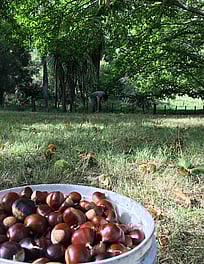 On the farm, you will find a chestnut orchard, an olive orchard, a pecan orchard, vegetable gardens, sheep, cows, chickens, worms, bees, silvopasture, establishing food forests, fruit orchards, hardwood timber plantations, regenerating wetlands and regenerating native bush.